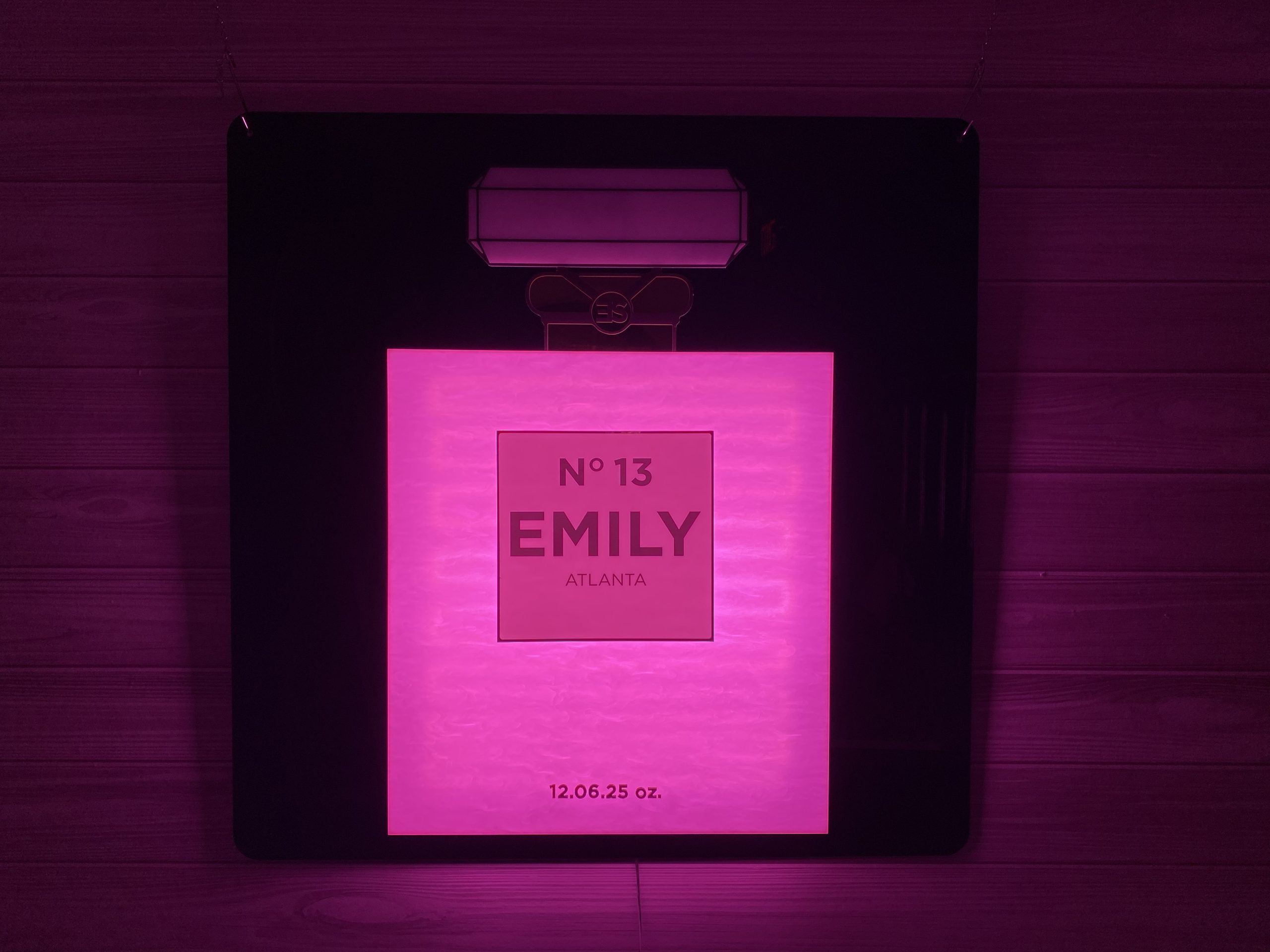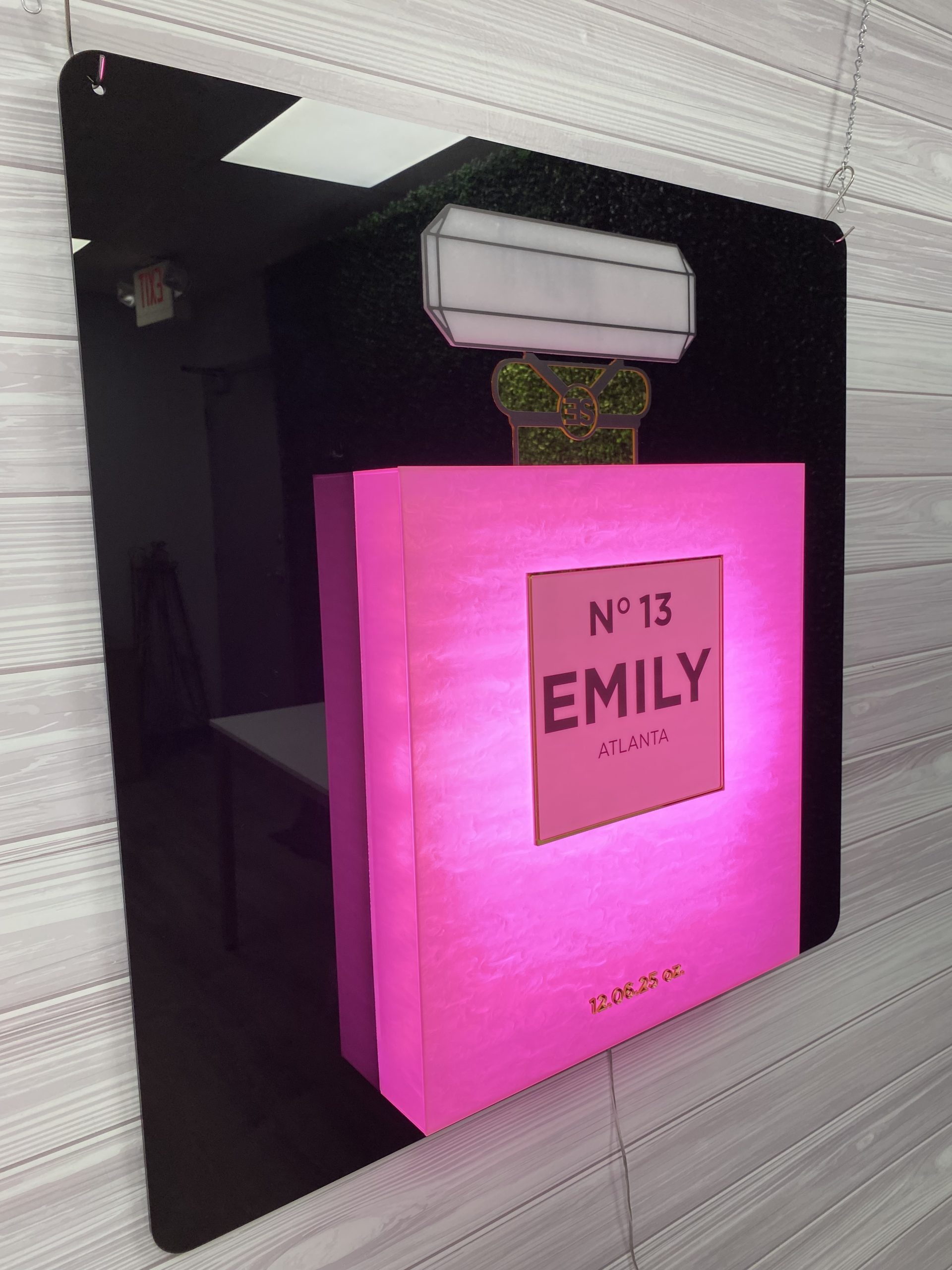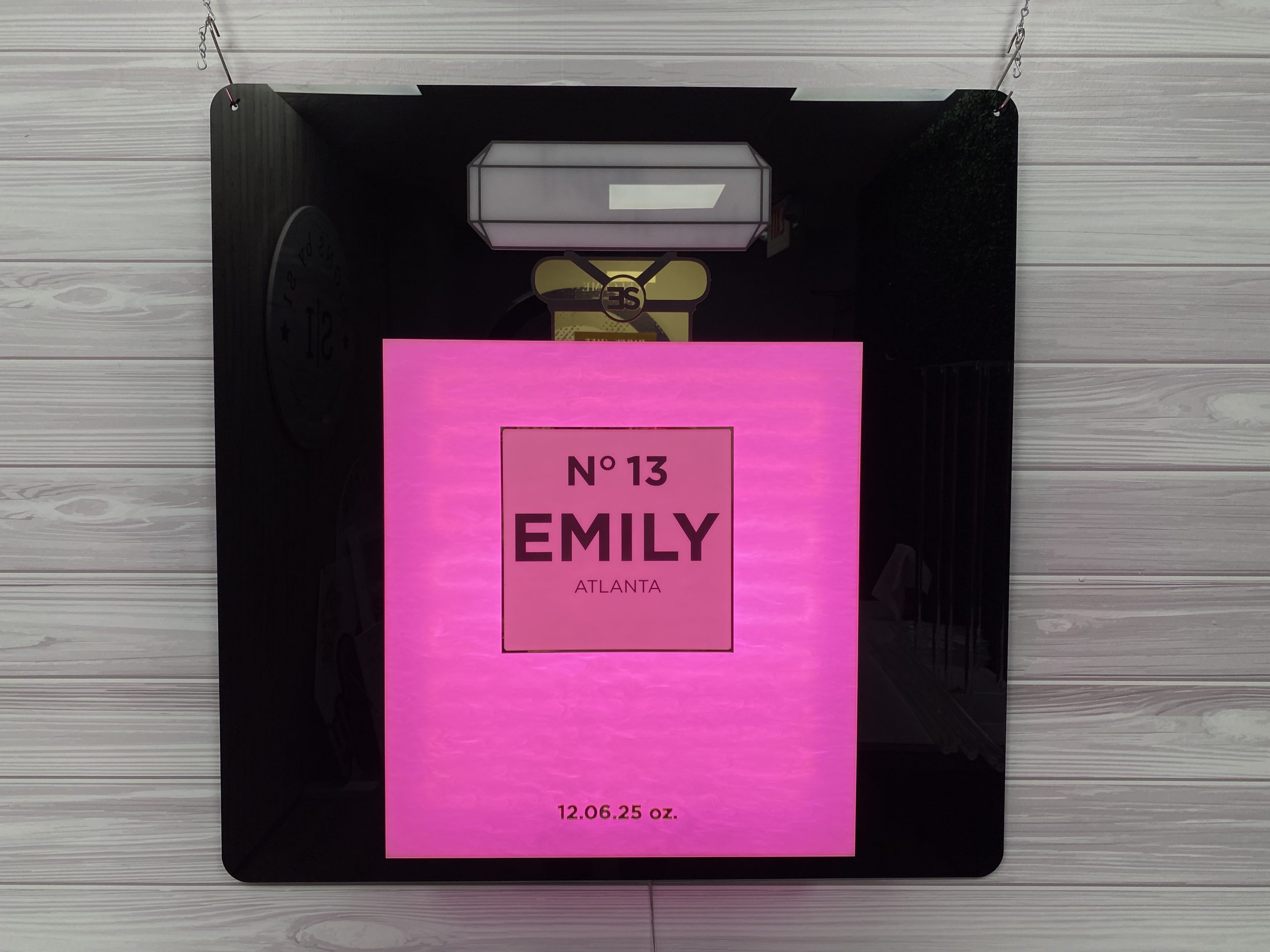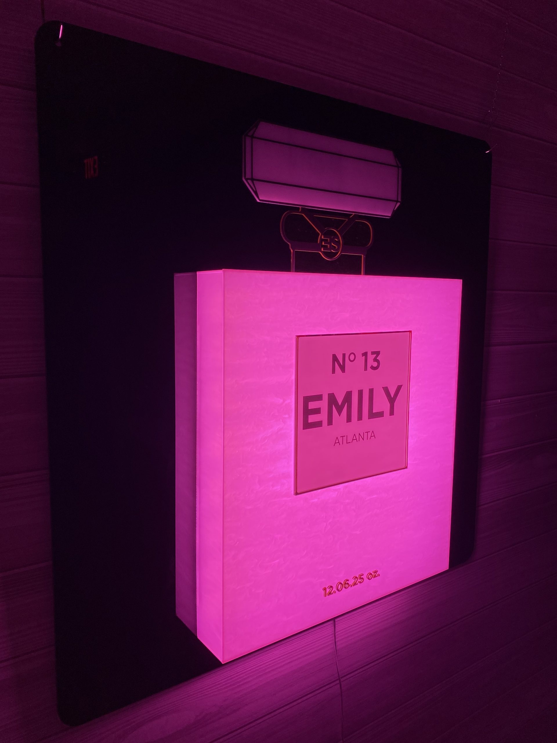 Call, text, or email for quote orders@signsbysi.com 404-272-6367. Custom Chanel Inspired Perfume Bottle Layered 3D  Acrylic + Neon Accent Sign In Board for Events, Wedding, Bar/Bat Mitzvahs