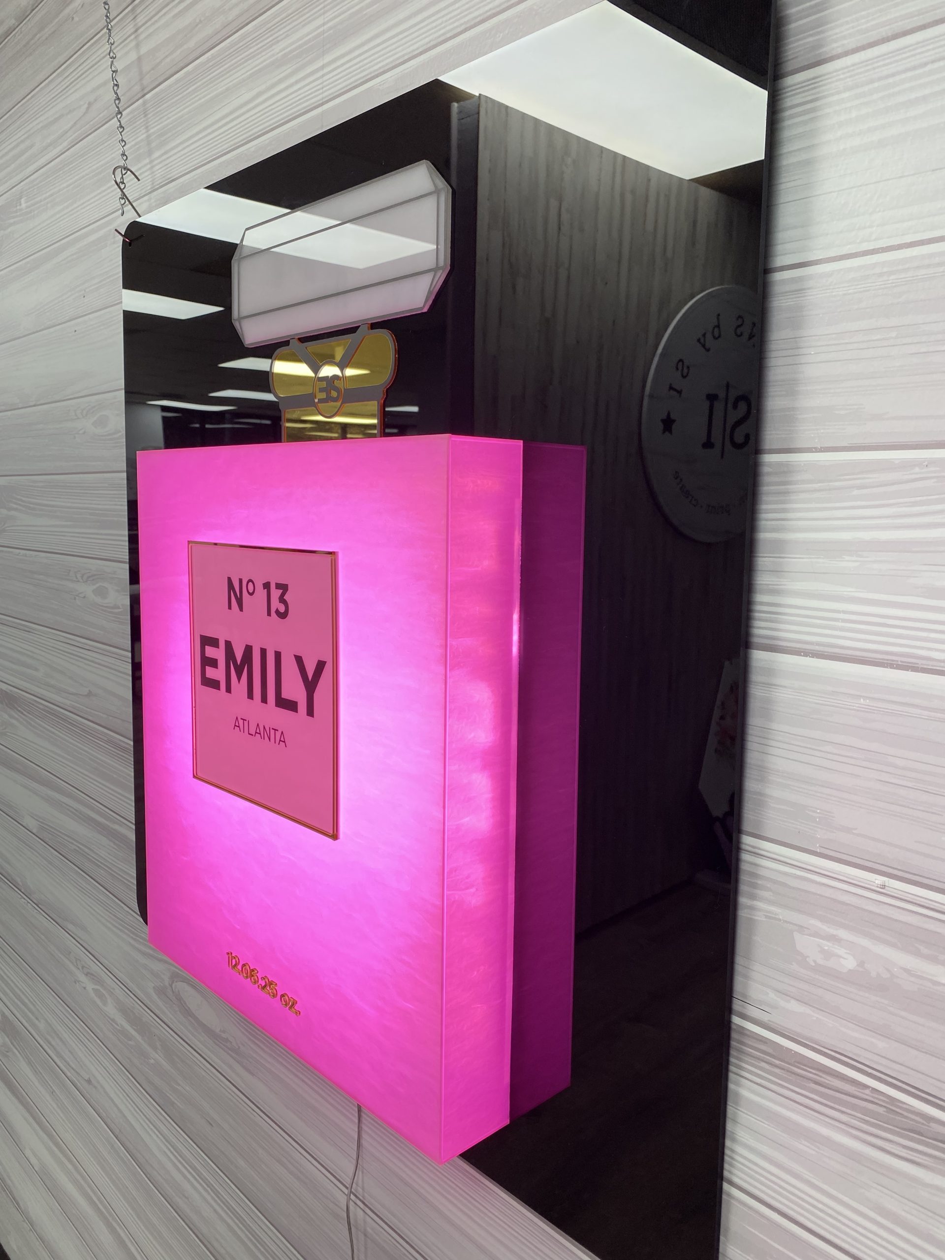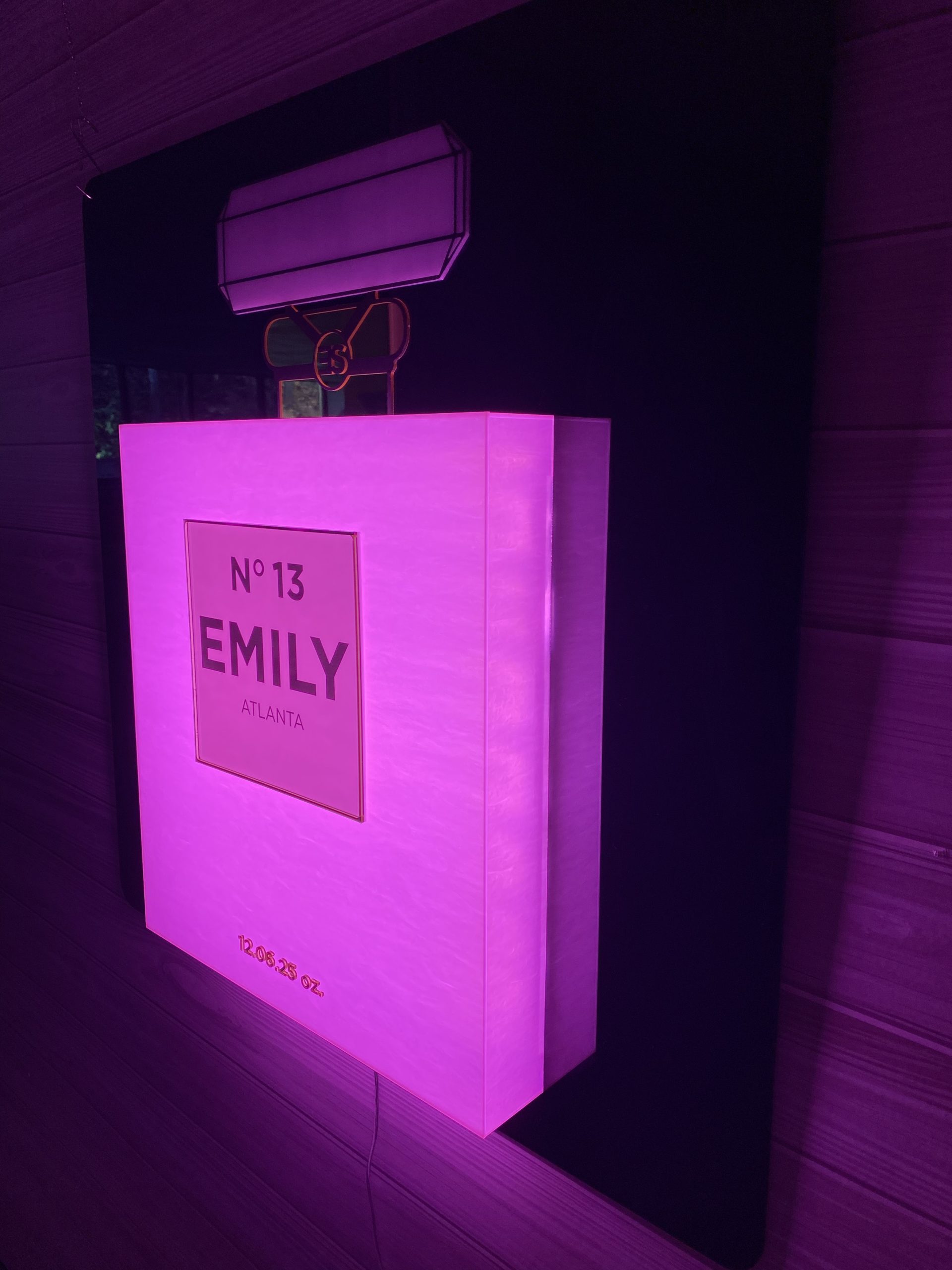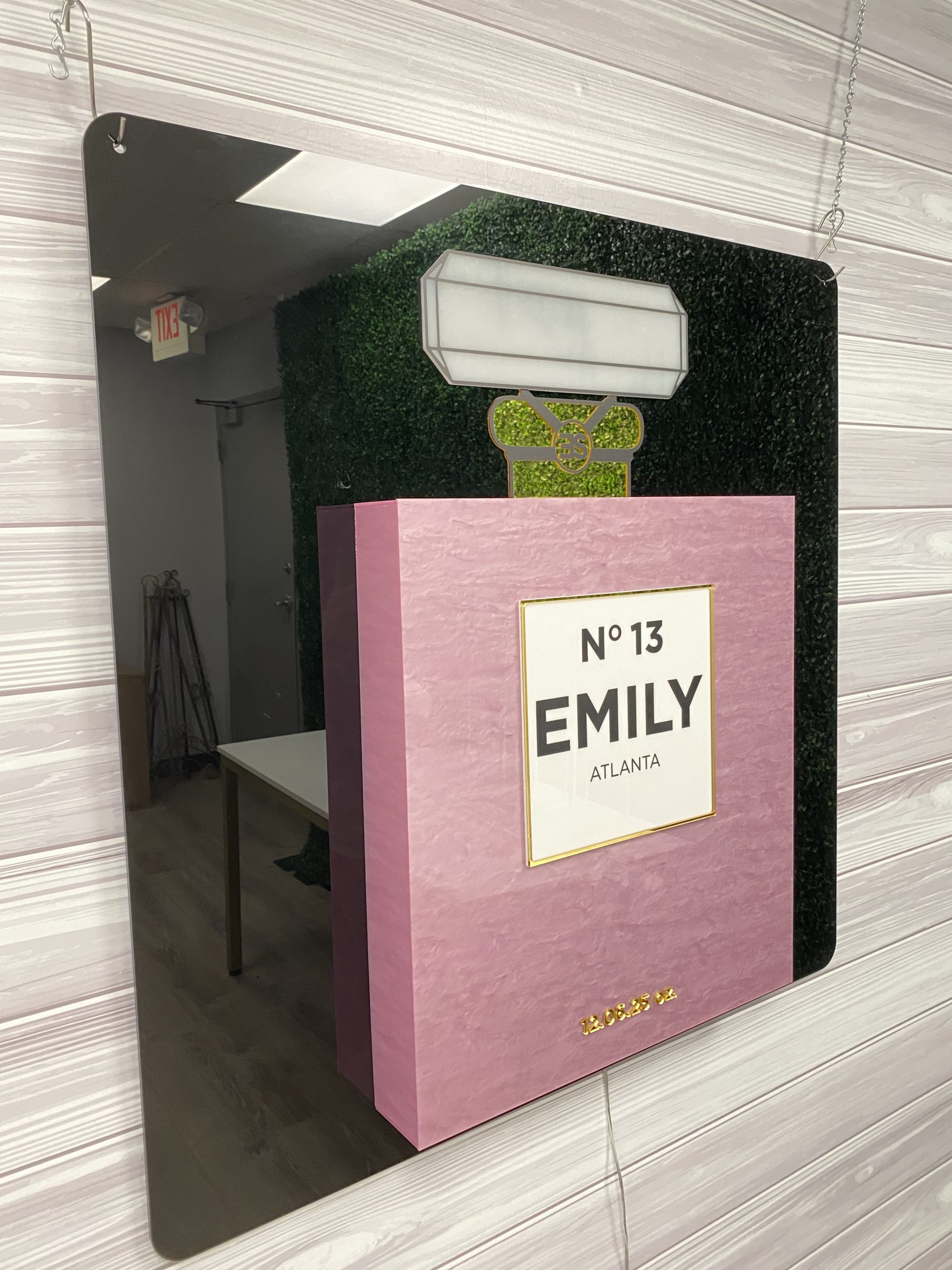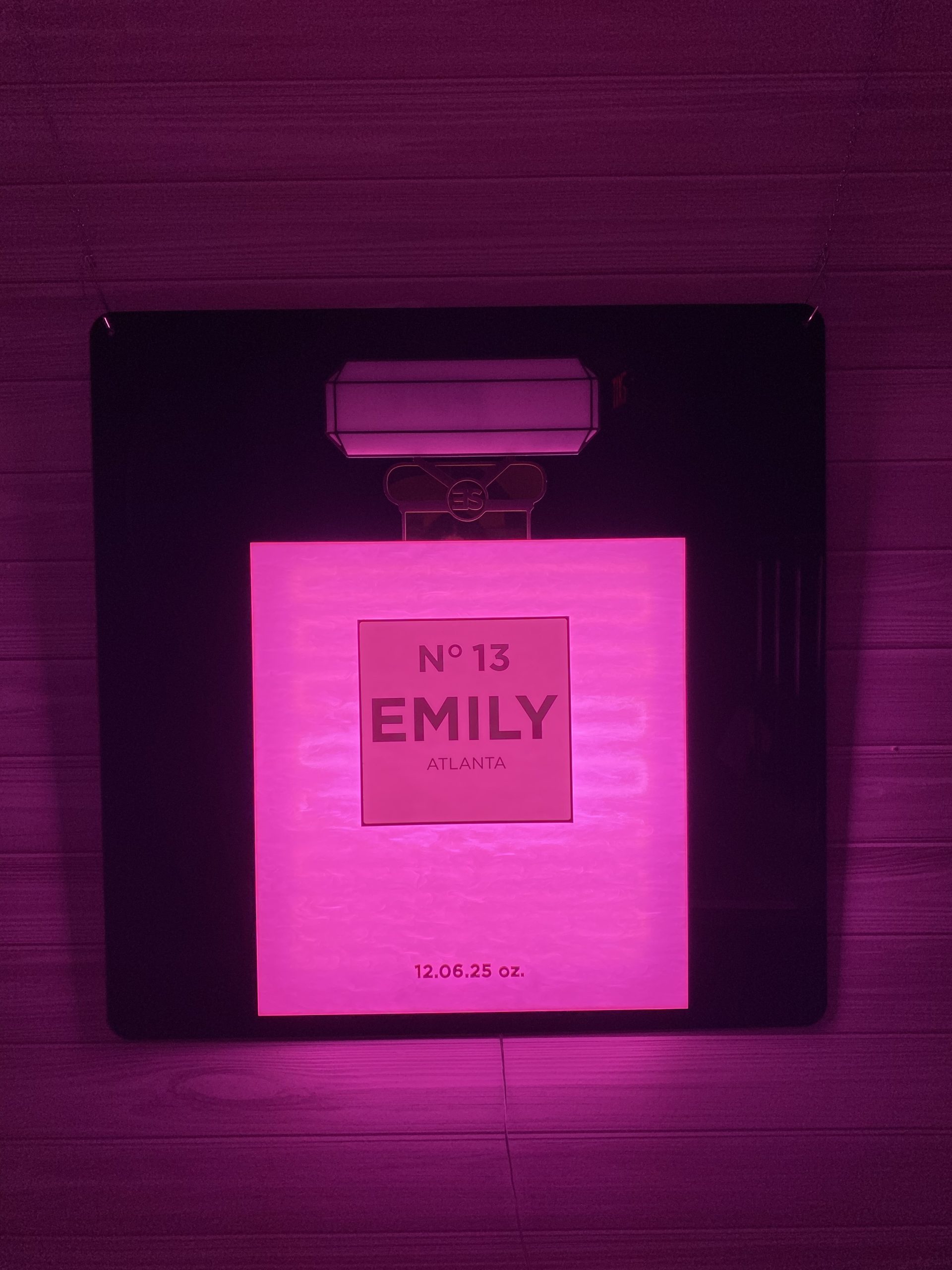 Call, text, or email for quote orders@signsbysi.com 404-272-6367. Custom Chanel Inspired Perfume Bottle Layered 3D  Acrylic + Neon Accent Sign In Board for Events, Wedding, Bar/Bat Mitzvahs
