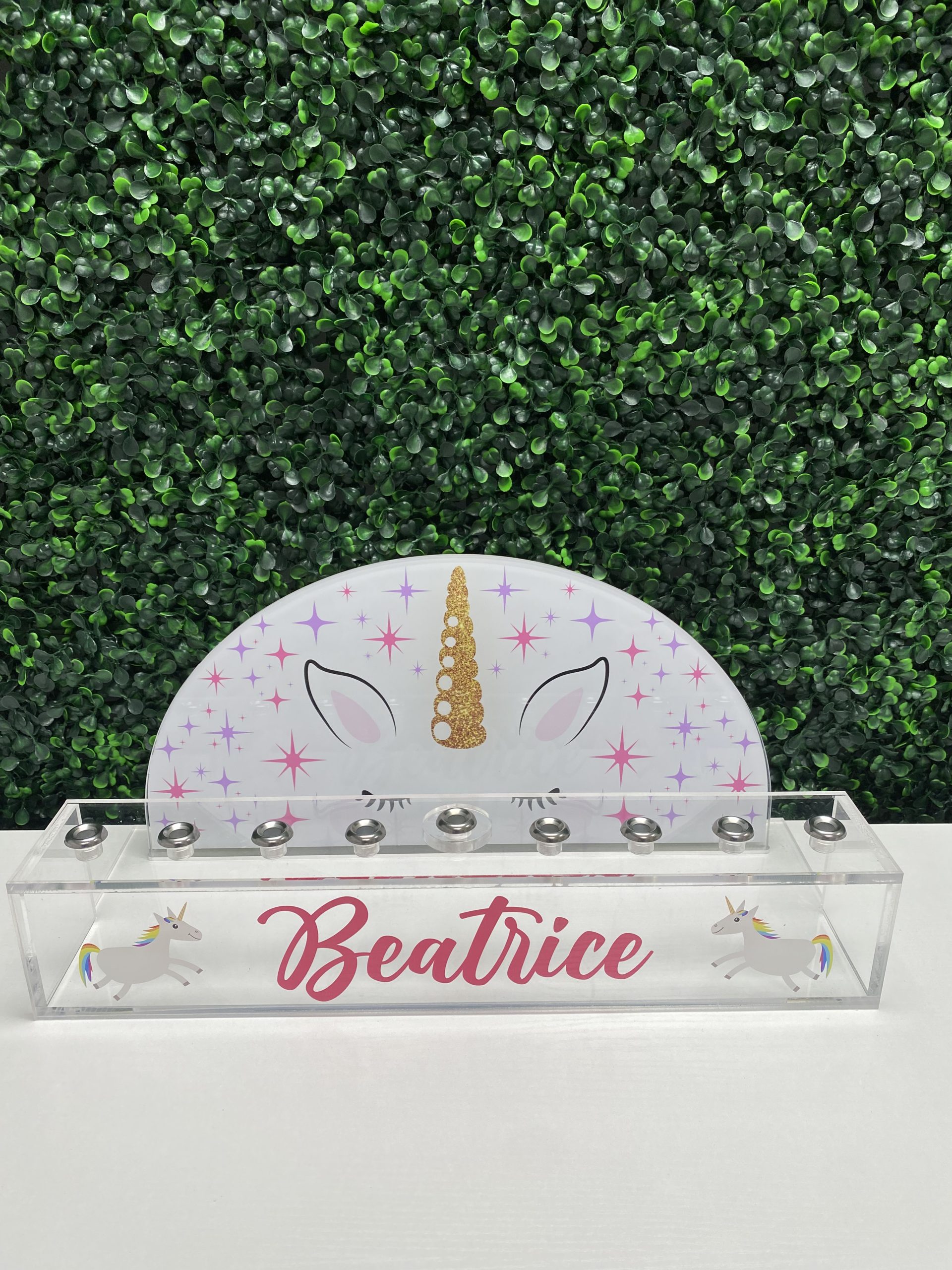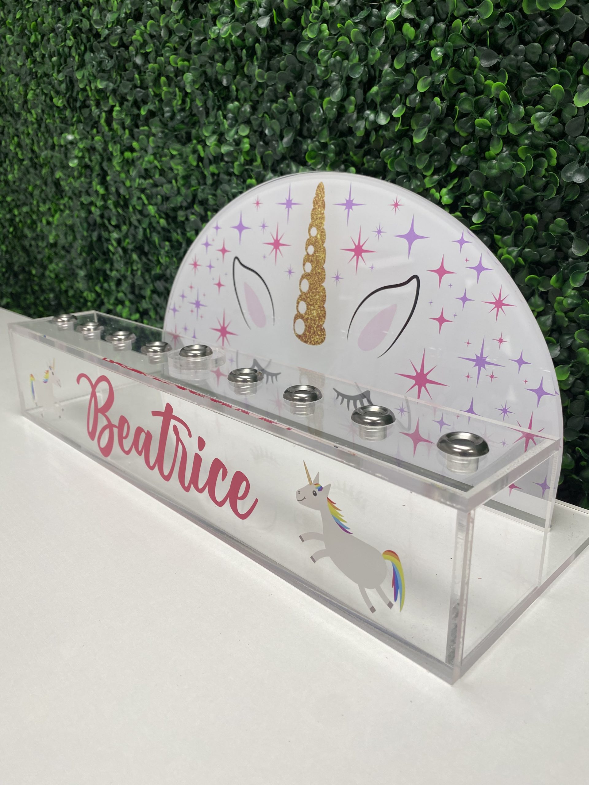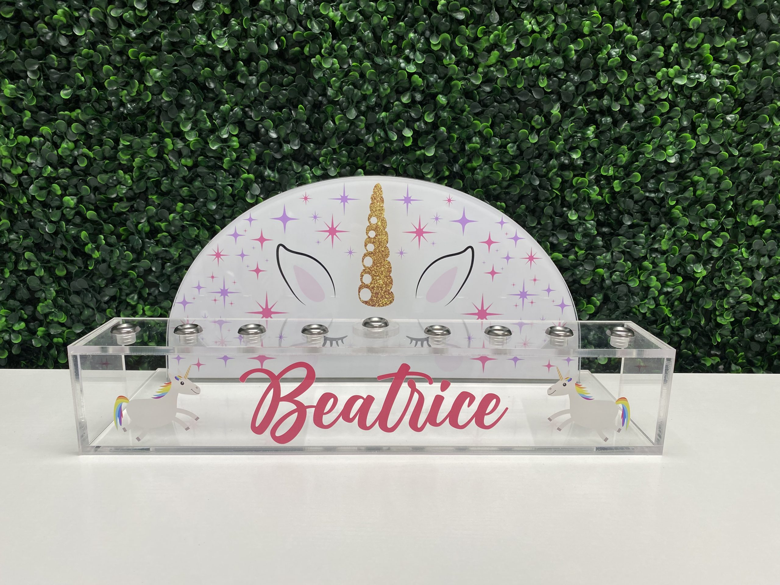 This is the perfect, unique, Customized Unicorn Hanukah gift Menorah or Hanukkiah for your loved one! UV Printed directly on to 1/4 inch Acrylic, this Menorah can be customized with a name, font color, and graphics or photo of your choice. If you do not see graphics that fit your needs, please call or email us for a custom order. Approximate size is 16 x 6 x 8.
