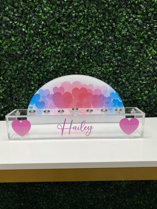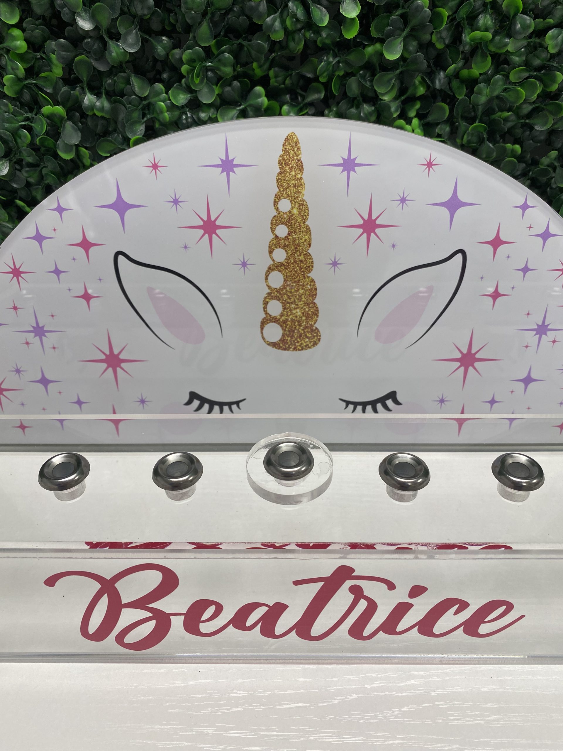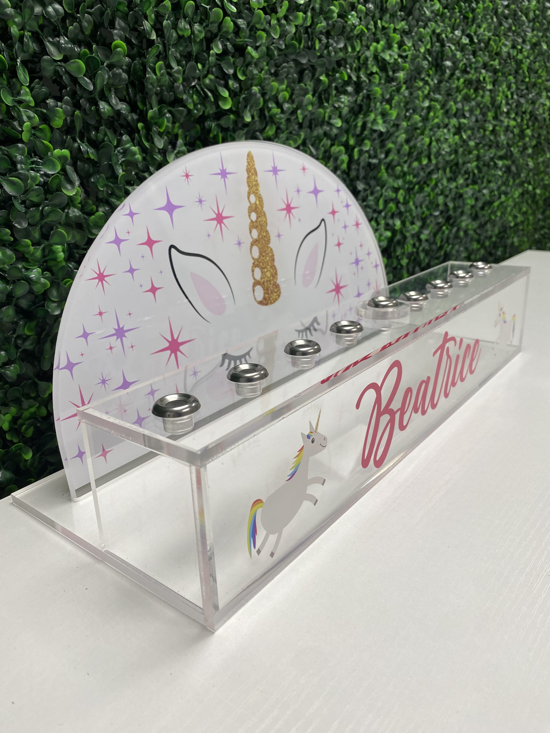 This is the perfect, unique, Customized Unicorn Hanukah gift Menorah or Hanukkiah for your loved one! UV Printed directly on to 1/4 inch Acrylic, this Menorah can be customized with a name, font color, and graphics or photo of your choice. If you do not see graphics that fit your needs, please call or email us for a custom order. Approximate size is 16 x 6 x 8.