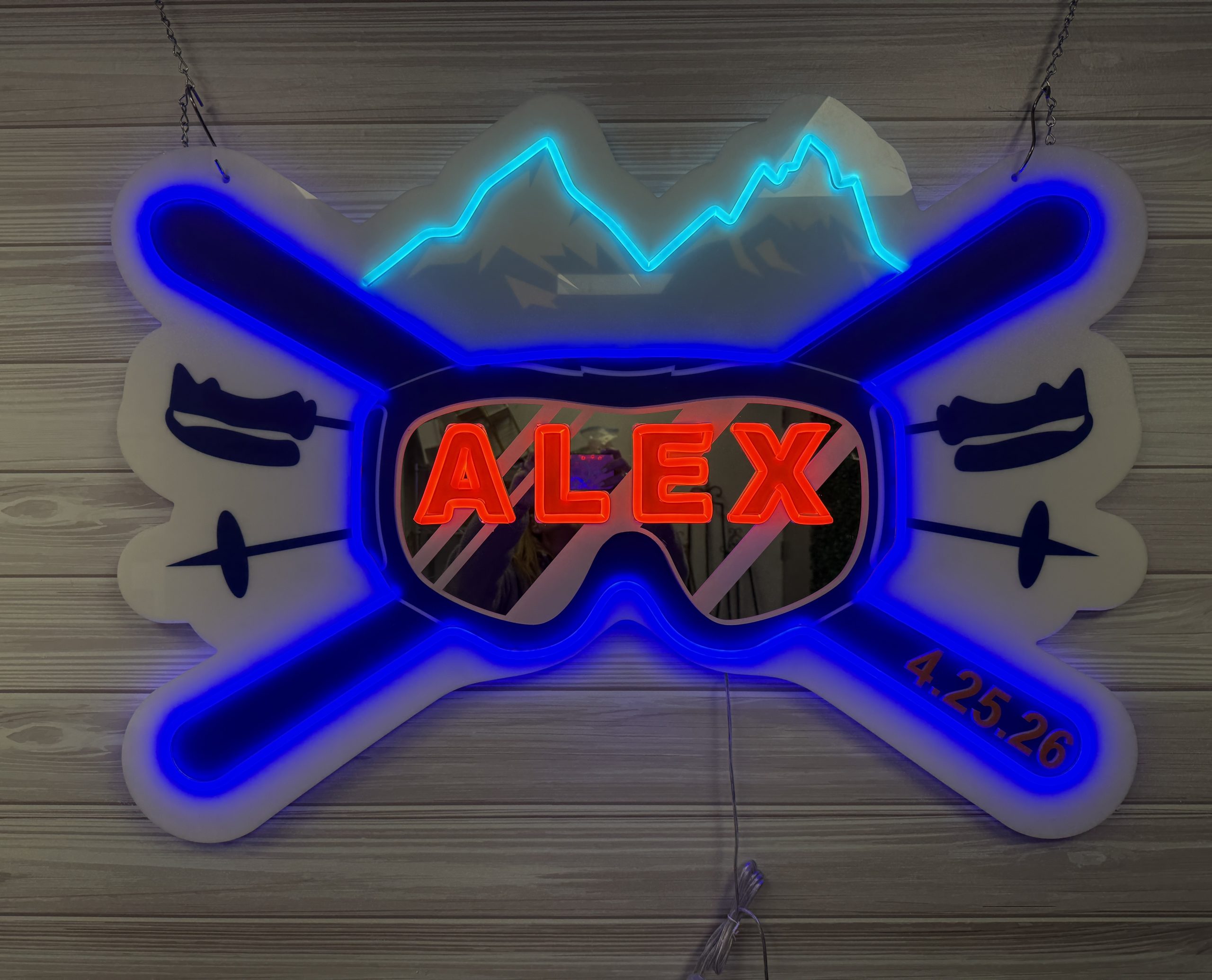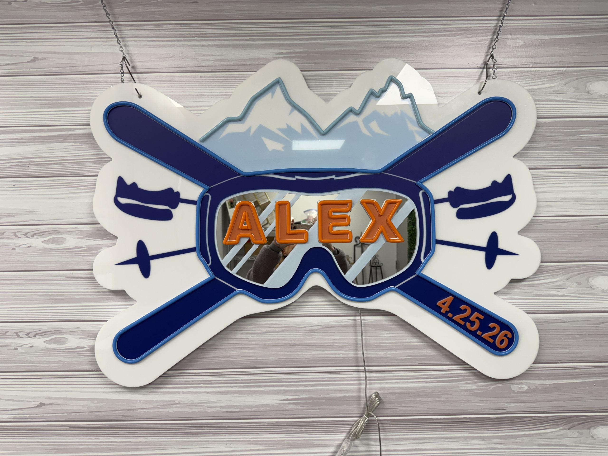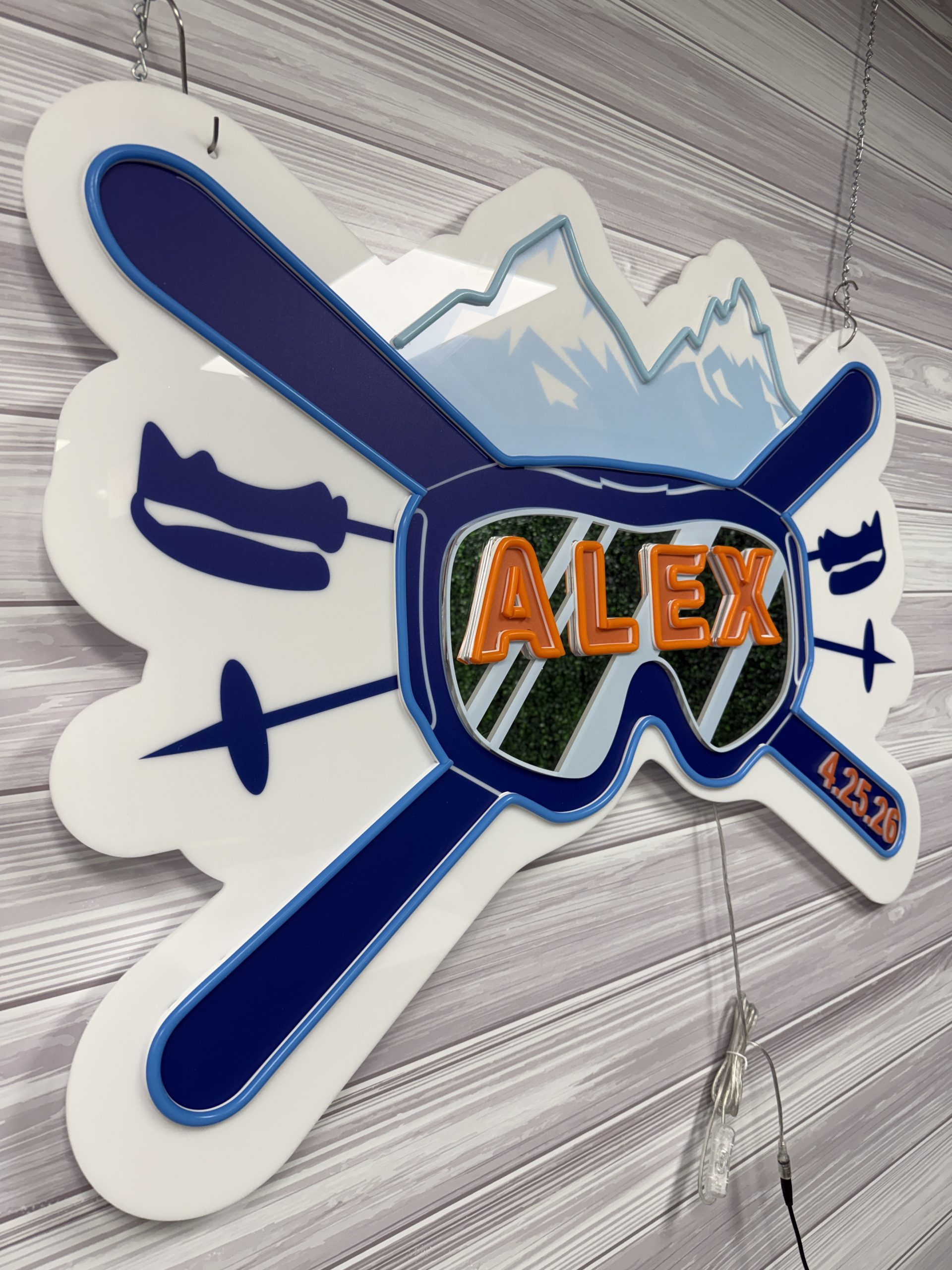 Whether you’re planning a mountain-inspired wedding, a memorable bar or bat mitzvah, or a winter birthday or anniversary party, this ski theme acrylic layered neon sign infuses your décor with energy, personalization, and eye-catching style. Custom themed signage like this also makes a thoughtful keepsake — a meaningful piece of art that commemorates your celebration long after the event ends.