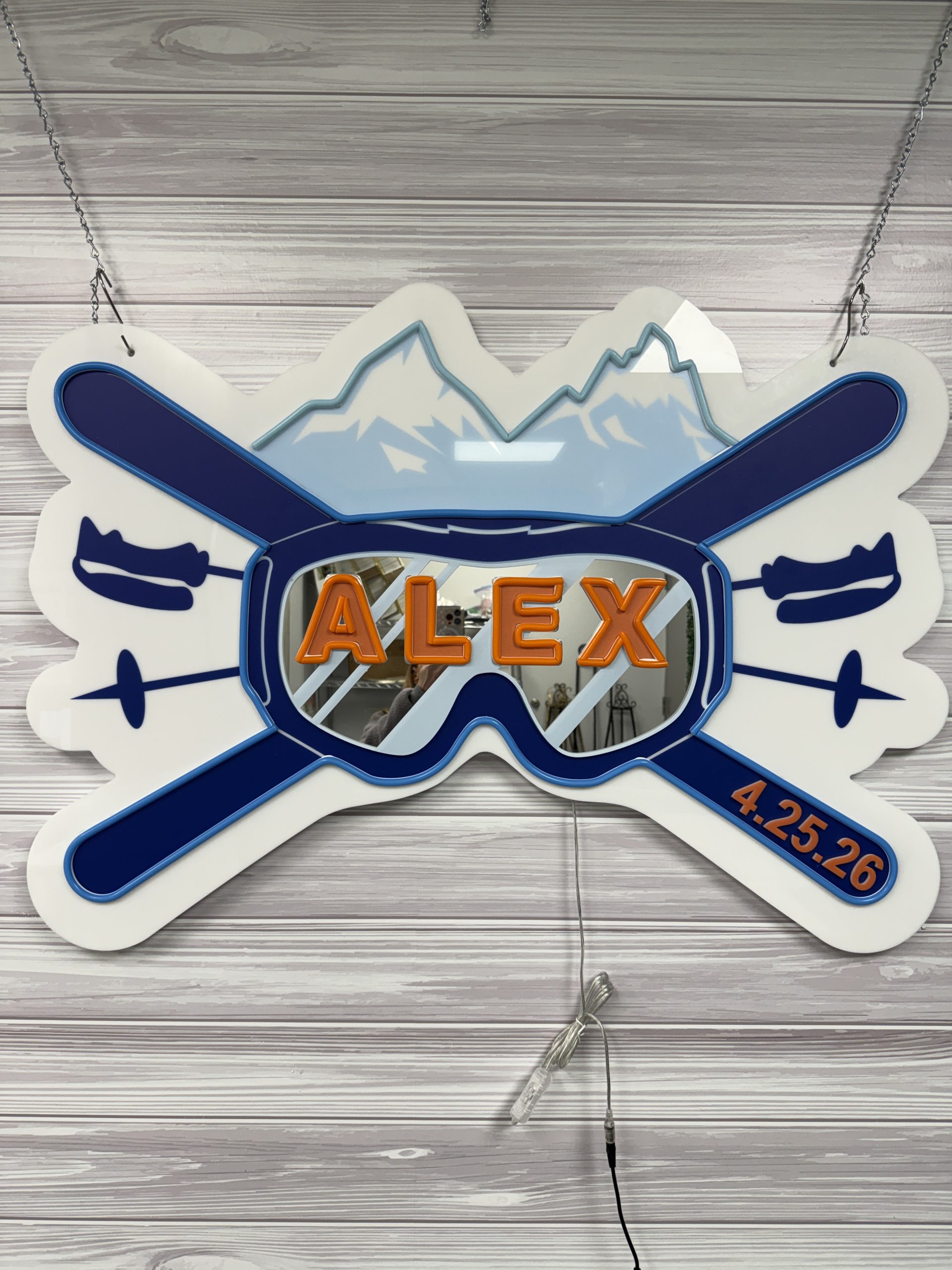 Elevate your event’s aesthetic with a sign that lights up the party and reflects your unique story — perfect for anyone who loves skiing, the mountains, or winter adventures.